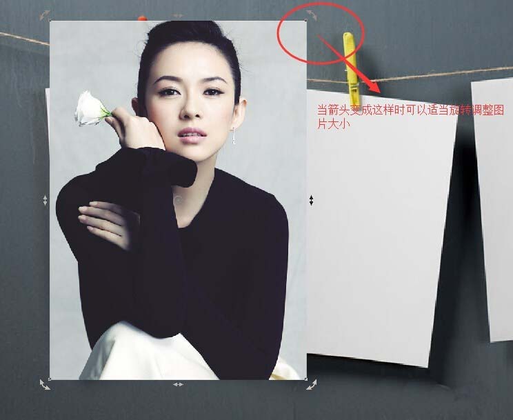 4、單擊選中導入的照片,將鼠標移到圖片的四個角的控制點上。當鼠標變為“←→”時可以調整圖片大小,當鼠標變為圓形“←→”時可以旋轉圖片。將圖片調整到合適位置。