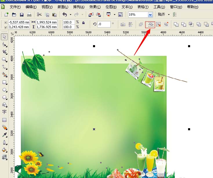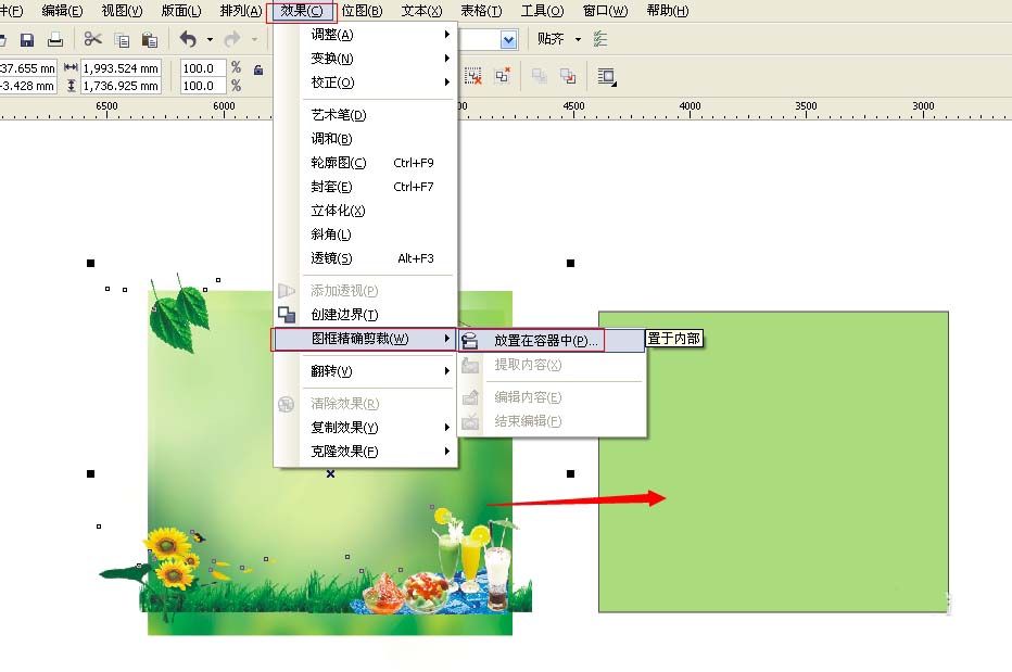 4、選中剛剛群組的圖片,然后,執行:效果——圖框精確裁剪——放置在容器中,群組后的圖片放置到步驟1繪制的矩形框中;