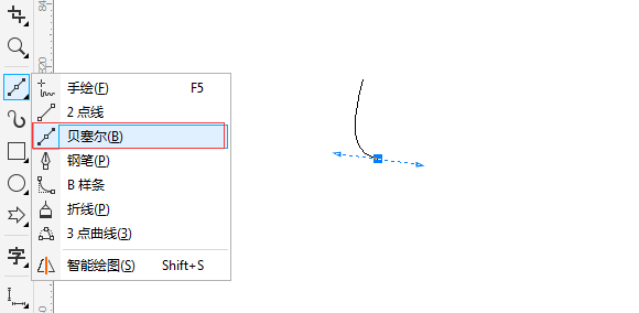 1. 打開CorelDRAW X8軟件,新建文檔,選擇工具箱中的“貝塞爾工具”,在繪圖區域,鼠標右鍵點擊定點,然后移動鼠標到適當位置拖動拉出手柄得到一條曲線時釋放鼠標,得到下圖所示曲線路徑。