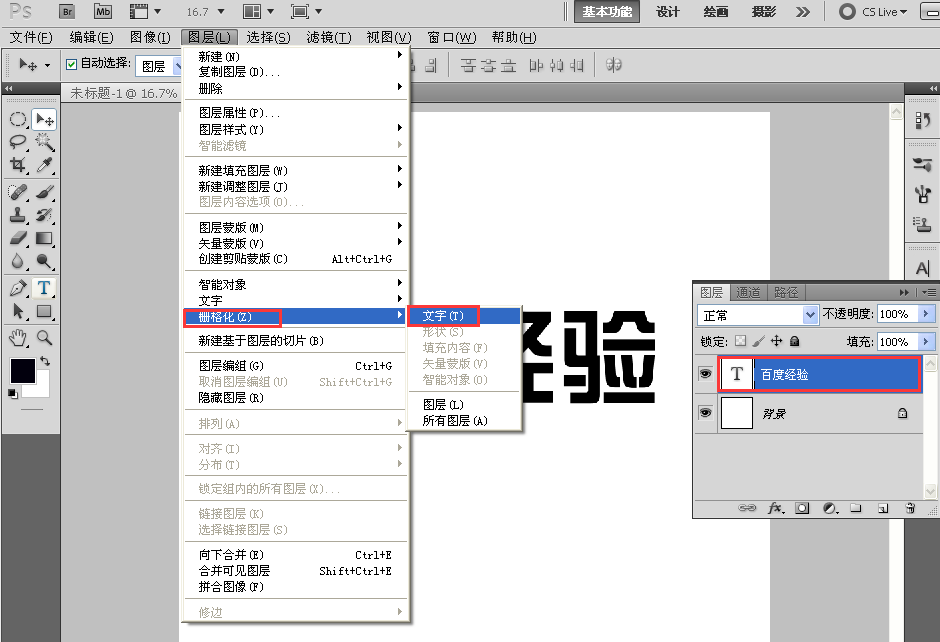 3、然后柵格化文字,柵格化文字如圖中所示,或者右擊圖層柵格化文字。