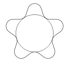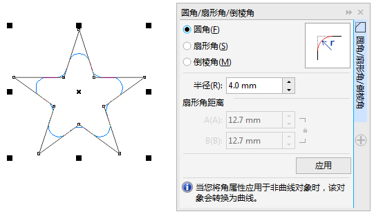 2. 在五角星選中狀態下,單擊菜單欄“窗口>泊塢窗>圓角/扇形角/倒菱角”命令,界面右側彈出“圓角/扇形角/倒菱角”面板。默認為“圓角”類型,根據圖形大小設置半徑數值(預覽當尖角為花瓣狀時為佳),如圖所示。