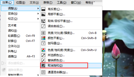 2、執行“效果>調整>取消飽和”去除圖片顏色,有關在CDR中將圖片去色的資料,請參閱:CorelDRAW X8對圖片進行去色處理的幾種方法。