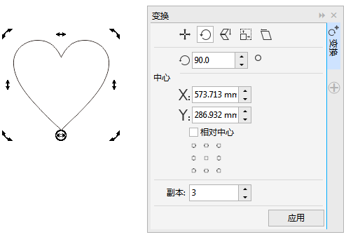 4. 選中心形,再次單擊,呈可旋轉狀態,將旋轉中心點垂直向下移動,執行“窗口>泊塢窗>變換”,在右側彈出的面板中選擇“旋轉”命令并設置旋轉選項,如圖所示。