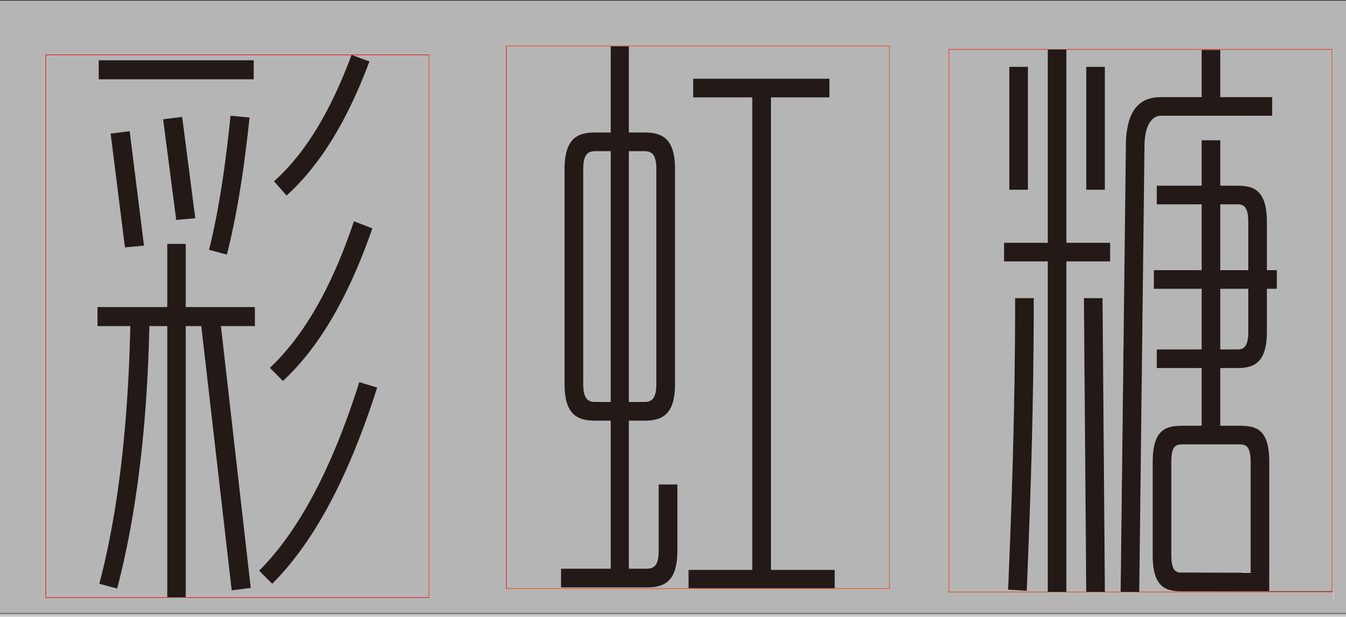 3、在CDR找一種類似于模板的字體,輸入彩虹糖,然后畫3個紅色的矩形框,把文字套進去,我這里使用的字體是:造字工坊悅黑纖細