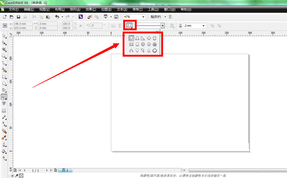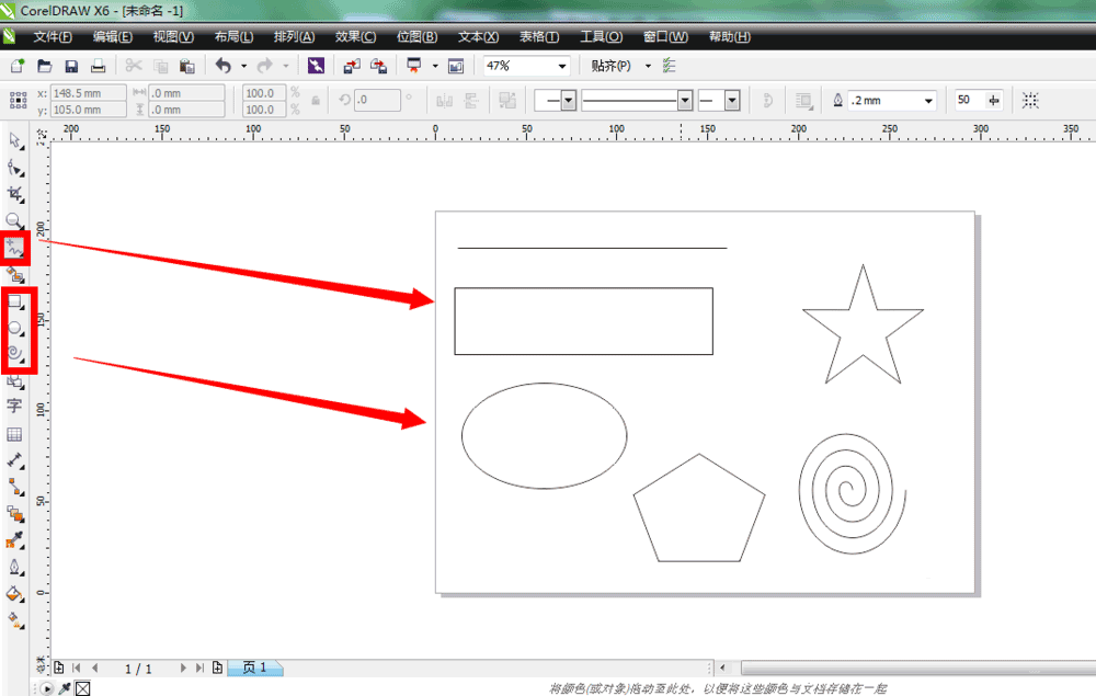 1、首先我們可以在cdr軟件左邊的工具欄里面選擇手繪工具、矩形工具等等其他工具,直接在頁面上繪制直線、矩形或者橢圓形等等常用的一些圖形形狀
