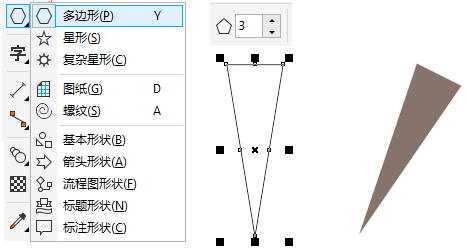 使用"多邊形工具"設置變數為3,按住鼠標左鍵從下往上繪制三角形,去除輪廓填充深褐色。