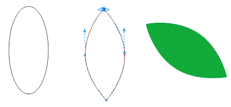 繪制橢圓形,轉曲使用"形狀工具"將上下手柄向中間拖動,形成葉子形狀,去除描邊填充綠色。
