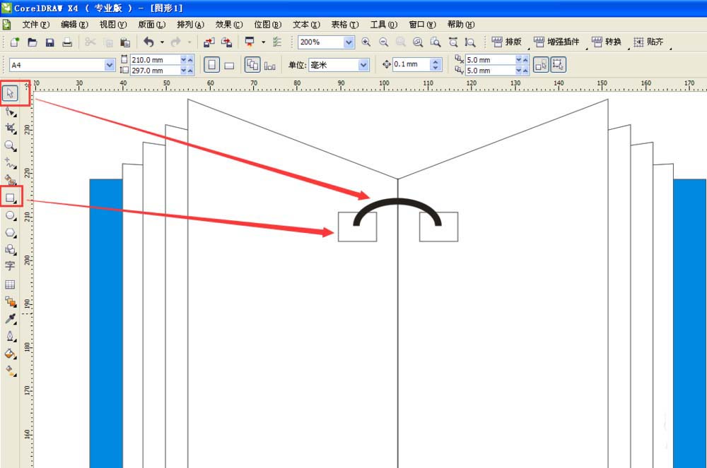 8、用挑選工具擺好位置,然后我們再用矩形工個繪制兩個矩形(也可以繪制一個,然后用鼠標右鍵復制一個),擺好位置。