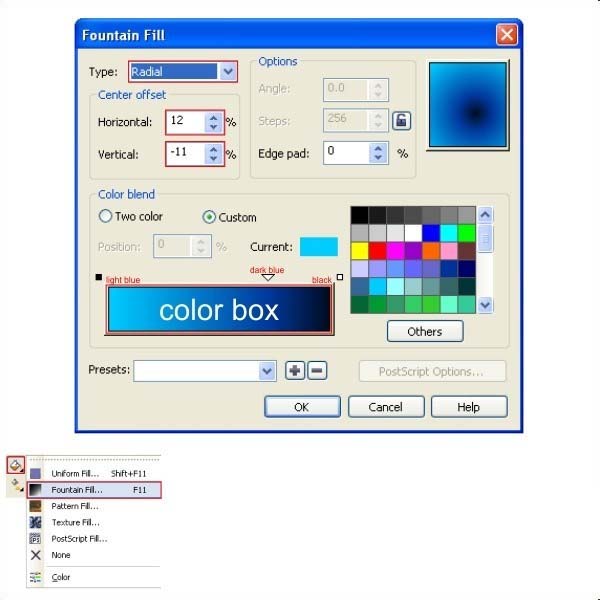8、之后,讓我們把色彩在里面,進(jìn)入“漸變填充工具”和應(yīng)用中的數(shù)值。