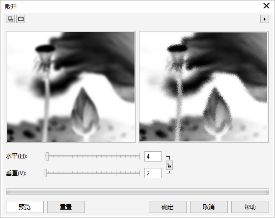6、再執(zhí)行"位圖>創(chuàng)造性>散開"。水平數(shù)值4,垂直數(shù)值2,到這一步,水墨畫的效果已經(jīng)出來了。