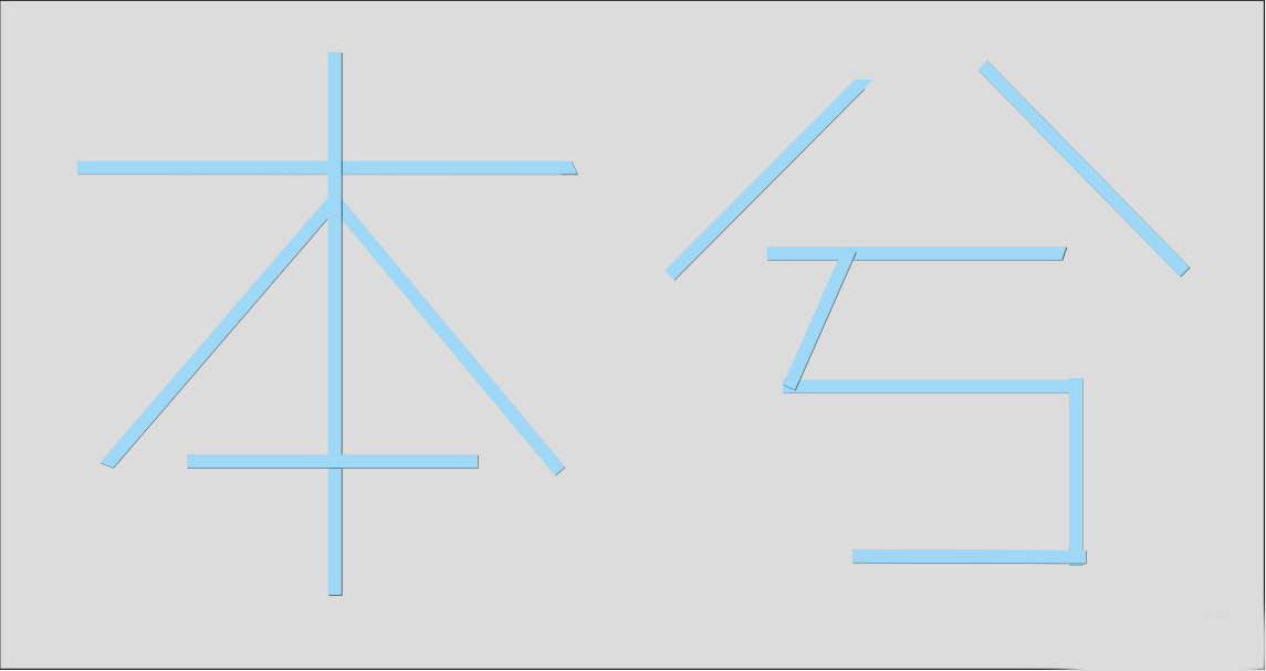 這就是最終的效果了,不過我為什么翻過來的是這2個筆畫呢,那是因為本的豎這一筆連接著其他是所有筆畫,如果把豎翻過來則貫穿了整個本字,藍色和紅色的對比效果我個人覺得是最好的,而折邊的地方也不是隨意的,本兮二字的折邊都是按照:一左一右,一上一下的規則進行選擇的結果,因為這樣的對比是最好的!