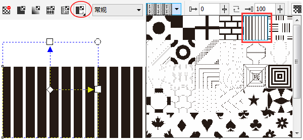 步驟2:在工具箱中單擊“透明度工具”,在屬性欄中選擇“雙色圖樣透明度”,圖樣選擇條紋圖樣,如圖所示。