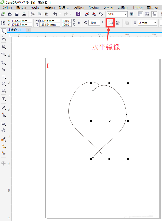 4、選中圖形,按鍵盤上面的數(shù)字鍵盤“+”號復(fù)制,然后拖動我們可以看到一個相同的另一半,點(diǎn)擊屬性欄中的水平鏡像,也就是將它翻轉(zhuǎn)了。然后執(zhí)行菜單欄中的視圖—貼齊—對象,我們將其移到合適的位置,它會自動貼齊。