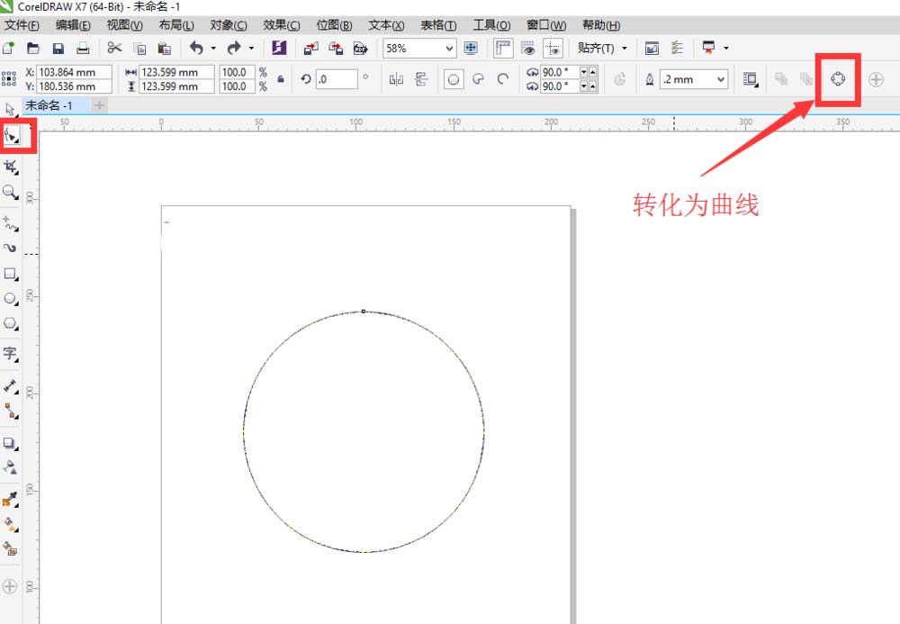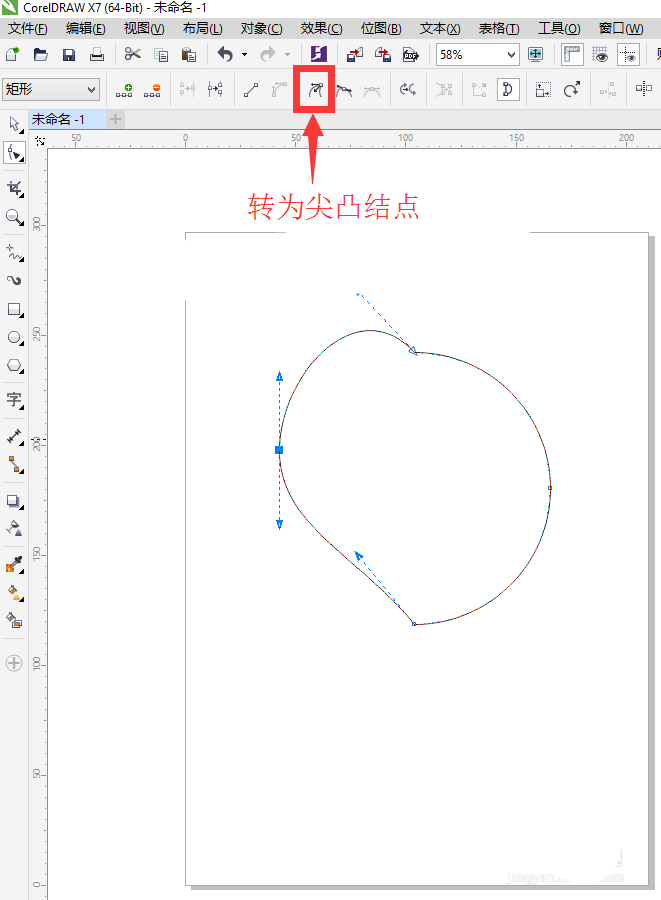 2、選擇工具箱中的形狀工具,再屬性欄中點(diǎn)擊轉(zhuǎn)化為曲線。轉(zhuǎn)化為曲線后,選擇上面的結(jié)點(diǎn),選擇轉(zhuǎn)化為尖凸結(jié)點(diǎn),然后將曲線手柄向上拉,同樣的下方的那個也向上拉,中間的那個上移就可以了。
