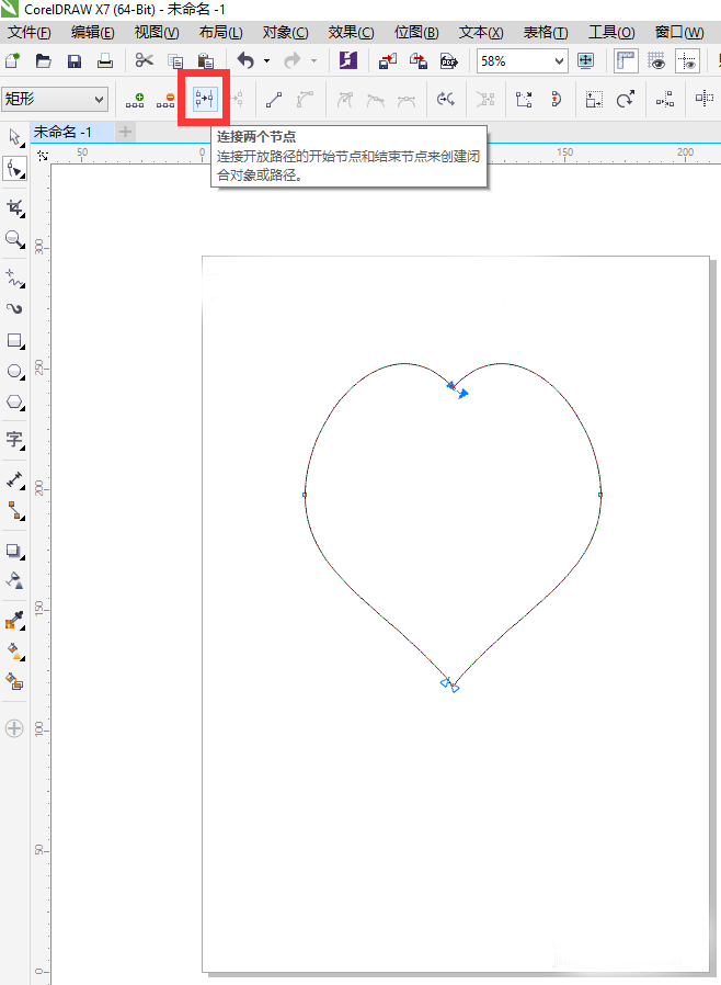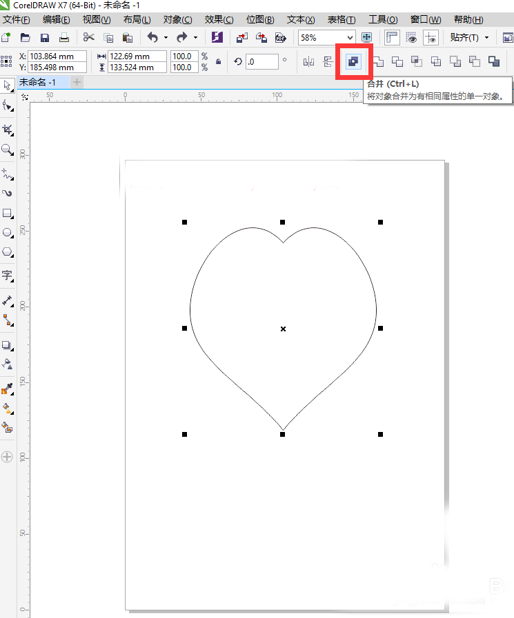 5、選中所有圖形,選擇屬性欄中的合并;合并后,在選擇工具箱中的形狀工具,選中節(jié)點(diǎn),點(diǎn)擊屬性欄中的連接兩個節(jié)點(diǎn)。連接后填充顏色,左鍵單擊右邊的顏色填充紅色,右鍵單擊右邊的顏色描邊黃色。