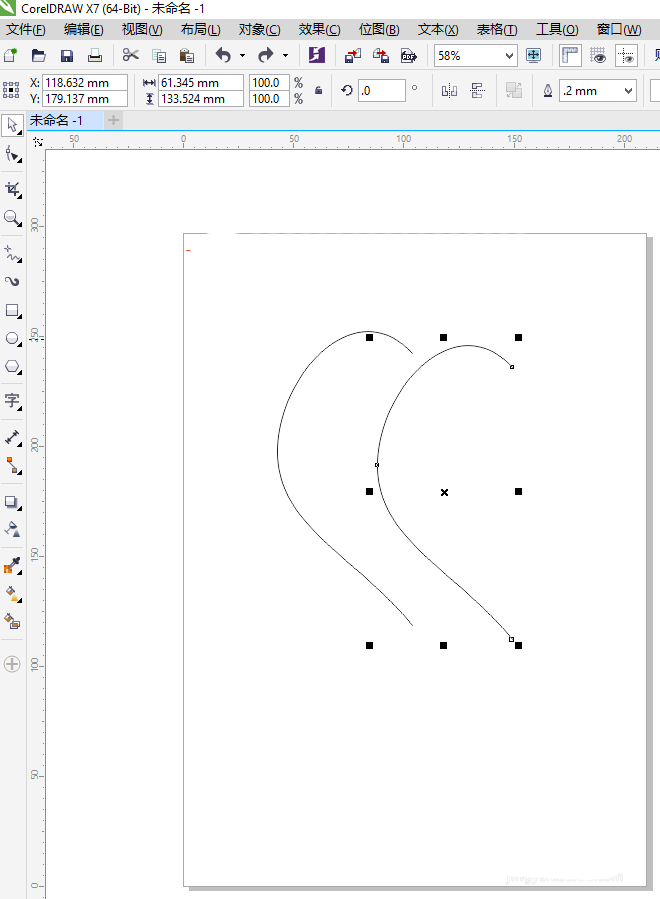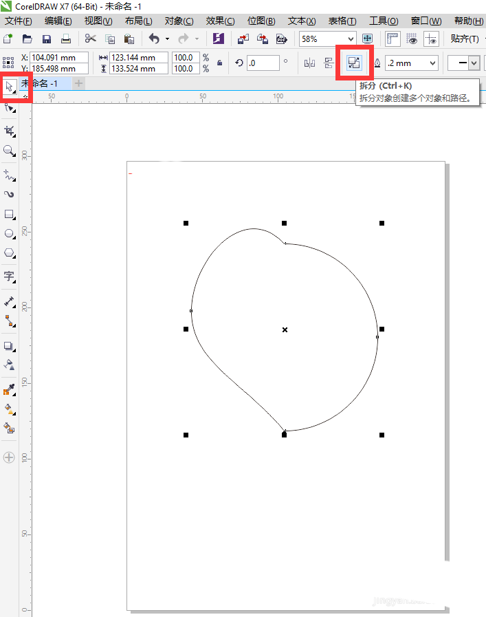 3、移動好后,選擇中間的兩點(diǎn),點(diǎn)擊屬性欄中的斷開曲線,斷開曲線后,它還是一個整體。這時候,選擇工具箱中的選擇工具,在屬性欄中找到拆分。拆分后,取消選擇,然后點(diǎn)擊右半部分,按Delete鍵刪除。