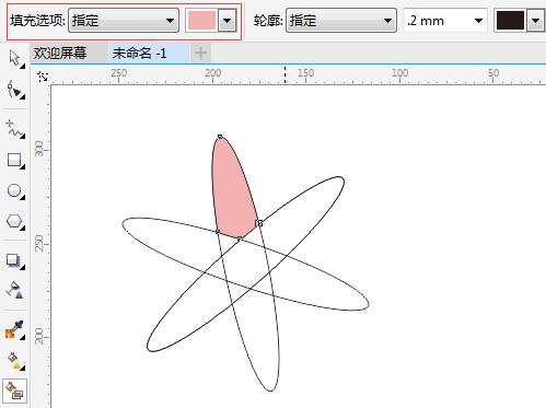 2. 在屬性欄上單擊“填充選項”下拉列表,選擇“指定”,單擊右側(cè)的“填充色”色樣,選擇一種顏色,在想要對象填充的區(qū)域單擊,即可填充該區(qū)域了。