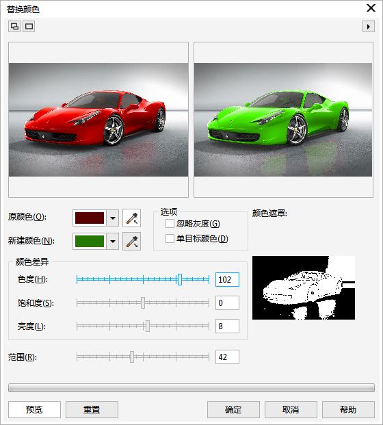 2.在彈出的“替換顏色”對話框中,點擊“查找”顏色按鈕,選擇顏色滴管工具吸取汽車上的紅色,在“新建顏色”位置替換為任意您喜歡的顏色,或者也可以調節色度。