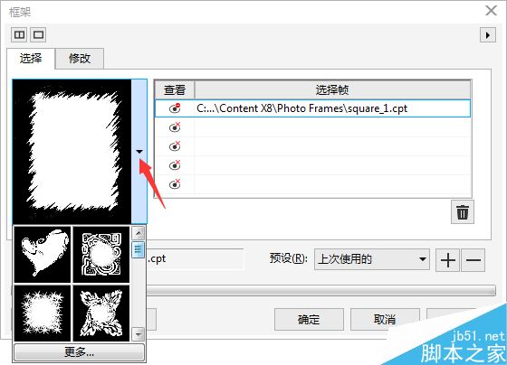 3. 打開“框架”對話框,根據(jù)照片的位置和預期效果,在“選擇”面板中選擇合適的“框架”類型,單擊框架預覽圖的右側(cè)三角按鈕,可展開框架類型。