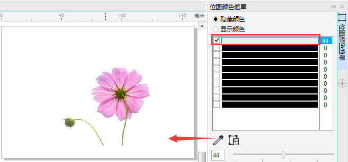 3. 選擇位圖,執行“位圖>位圖顏色遮罩”命令,在界面右側彈出的“位圖顏色遮罩”泊塢窗中選“隱藏顏色”即將選定的顏色隱藏,在顏色列表中選擇第一個顏色條,將其勾選。