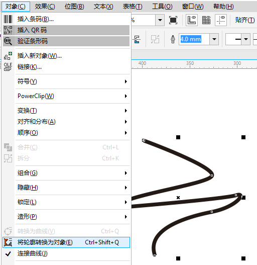 1. 在選擇曲線段的狀態下,執行“對象>將輪廓轉換為曲線”命令(快捷鍵‘Ctrl+Shift+Q’),如圖所示。