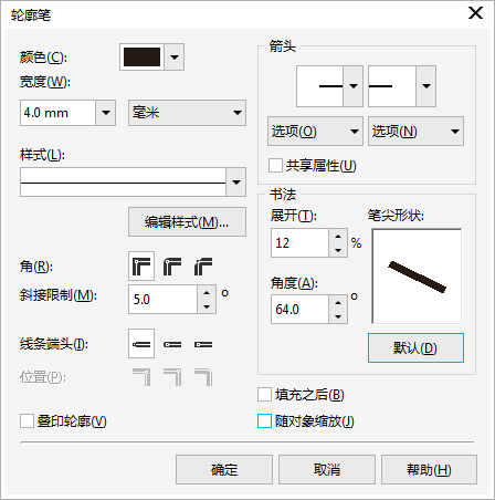 2. 點擊“輪廓筆”工具,快捷鍵“F12”(如果在CDR X8工具箱中沒有,可點擊快速自定義,展開輪廓筆工具欄)。在“書法”屬性中設置“展開”和“角度”數值,該命令針對斷開曲線,可以以書法字體的感覺創建粗細不均的輪廓和旋轉傾斜角度,以實現輪廓線的粗細變化。