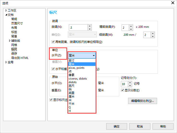 2. 在“單位”區(qū)域內(nèi),從“水平”列表框中選擇一種測(cè)量單位。如果希望對(duì)垂直標(biāo)尺使用不同的測(cè)量單位,不勾選“水平和垂直標(biāo)尺使用相同的單位”復(fù)選框。然后在垂直列表框中選擇一種測(cè)量單位。