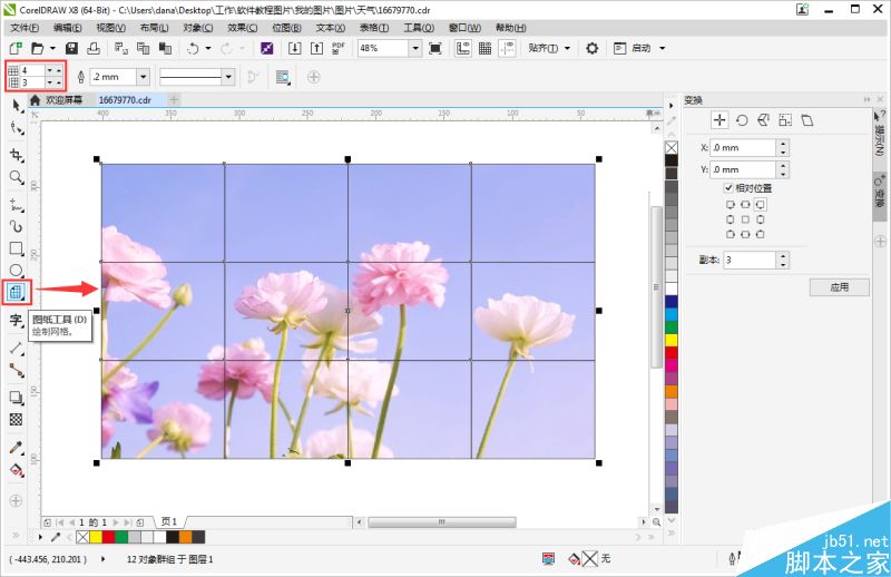 2、找到工具箱中的圖紙工具,并且先設置好圖紙的行數(shù)、列數(shù)(若要將圖片等分12份,行列數(shù)可設置3和4),記住,必須是先設置后繪制才可以,反之則無效。