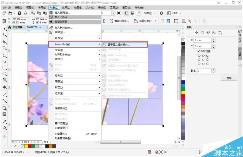 3、按Tab鍵(系統(tǒng)會按照你的繪圖先后順序逐步選取對象),選中圖片,執(zhí)行“對象>PowerClip>置于圖文框內部”命令,當出現(xiàn)黑色粗箭頭時,單擊表格,實現(xiàn)圖框精確剪裁。
