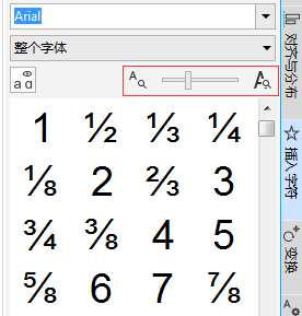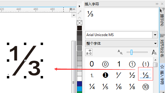 5. 從“整個字體”列表框中選擇心儀字體,選擇要插入的分數符號,直接拖拽到工作區域即可;或者把符號字符當做一個文本插入。使用文本工具,在頁面的空白位置上單擊一下,就會出現一個閃爍的光標,鼠標雙擊符號字符面板上的某個符號。