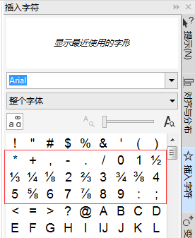 一、使用“插入字符” CorelDRAW中的插入字符包含可作為圖形對象或文本對象插入文檔的特殊字符,你可以訪問各種符號,包括國際字符、數學符號、貨幣符號、書法裝飾形狀、形狀、星形、箭頭和其他按主題組織的符號。