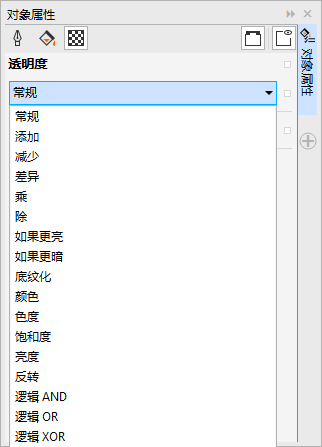 3. 在選中矩形的狀態(tài)下,選擇工具箱中的“透明度工具”,在其工具欄屬性的“合并模式”中單擊右側(cè)黑色三角號,出現(xiàn)多種透明度合并模式的設(shè)置。這類似于PS中的圖層混合模式,如:“標準模式、疊加模式、柔光模式”等等。