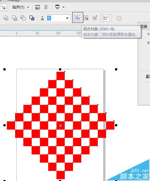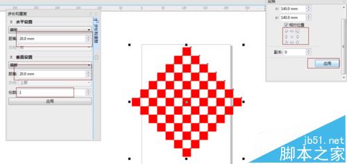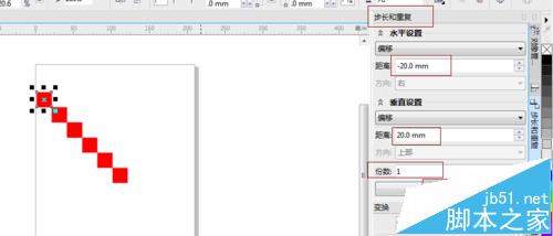 4、將所有全選,變換-->相對位置-->右上;變換-->x:20mm ;-->垂直:20mm;點擊【步長和重復】,垂直偏移::20mm;水平偏移:20mm,份數1份-->運用。然后按CTRL+D,直到成一個正方形的效果就可以了。