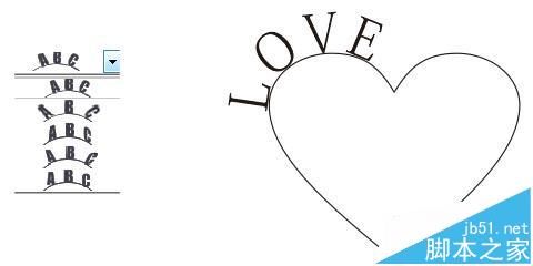 2、將光標移到圖形的輪廓線上,當光標右下角顯示曲線圖標~時,單擊鼠標左鍵,此時光標大半在輪廓線外,小部分在輪廓線內。您可以輸入文本(本文以LOVE為例),屬性欄上出現相關選項。