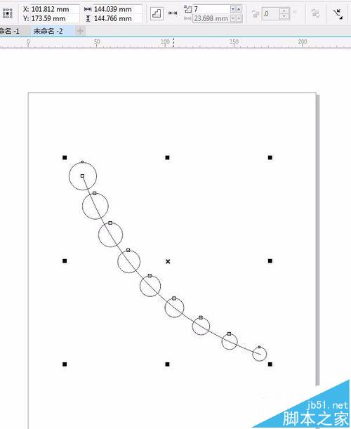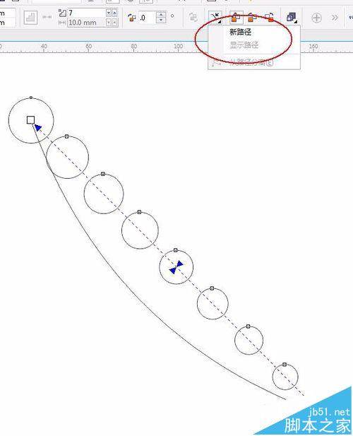 5、這一步,就是開始調節同一線上圓的密度啦,這個也是個人喜好哦(我這里設置的是7個哦)然后在那一串圓上右擊會出現新路徑或者工具欄里面也會有,選擇弧線為新路徑