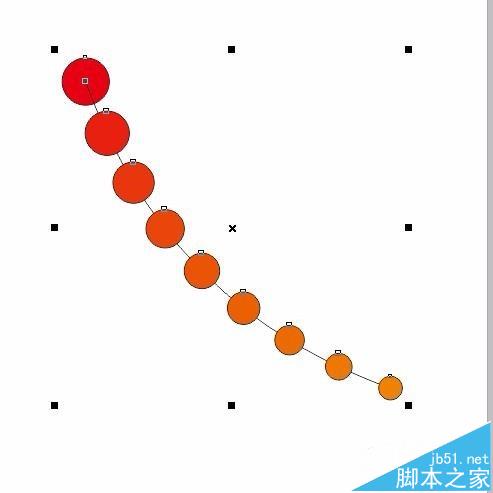 7、再選最底端的圓,填充為桔紅色,然后你馬上就看到了下圖的樣子,哈 哈(因為中間的七個圓是調和工具調和出來的,所以在沒拆分調和之前中間七個一體的,兩端的兩個圓是自己可以隨意調動的,中間七個會隨項端兩個的變化而變化)