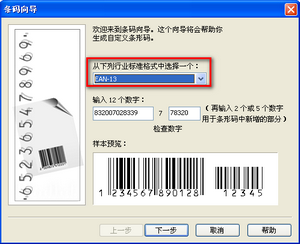 3、在彈出的條碼導航對話框中設置參數:在“從下列行業標準格式中選擇一個”參數項里選擇EAN-13(中國通用格式)