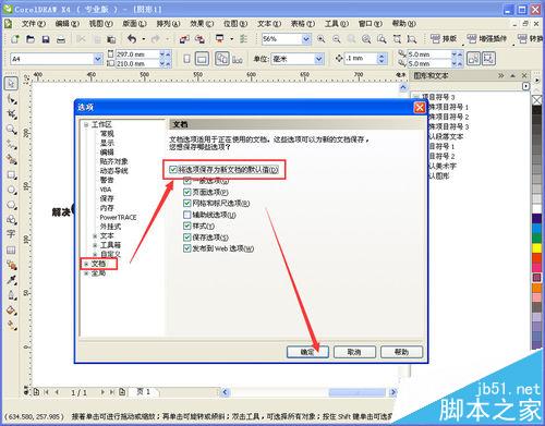 9、設置文檔保存。接上步彈出設置框,如圖,選擇“文檔”——“將選項保存為新文檔的默認值(D)”打鉤,然后確定,OK!