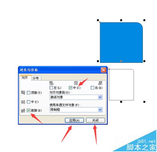 5、用挑選工具,把兩個圖形都選擇上,再點擊上邊屬性欄的”對齊和屬性“按鍵。將左右居中勾選上,將底部對齊也勾選上,再點擊應用,最后點擊關閉。