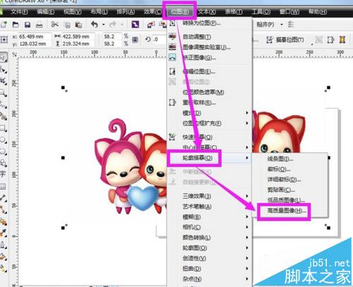 4、接著,如下圖那樣,在軟件界面上方里找到“位圖”的選項(xiàng),用鼠標(biāo)點(diǎn)擊它,在它的下拉列表里面選擇“輪廓描摹”,然后再在展開的列表選項(xiàng)里點(diǎn)擊“高質(zhì)量圖像”。