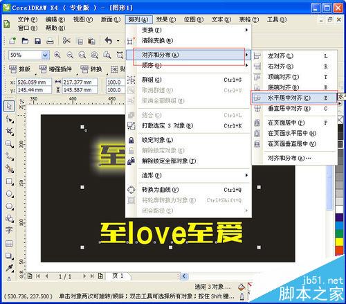 8、二者對齊。框選中,選擇”排列“——”對齊與分布“——”水平居中對齊“