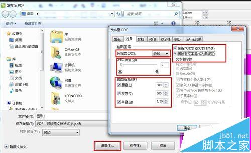 3、接著,再調(diào)整下對(duì)象,在對(duì)象里面,我們將壓縮類型選擇【JPEG】將JPEG質(zhì)量調(diào)到【高】,并將【壓縮藝術(shù)字和藝術(shù)線條】、【將所有文本導(dǎo)出為曲線】勾上。