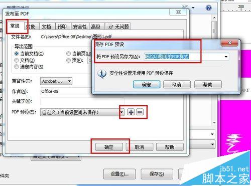 2、做好設(shè)計(jì)后,我們先調(diào)整下兼容性:步驟【文件】→【發(fā)布至PDF】→【確認(rèn)文件名】→【設(shè)置】→【兼容性】→【Acrobat 5.0】,將兼容性選擇Acrobat 5.0
