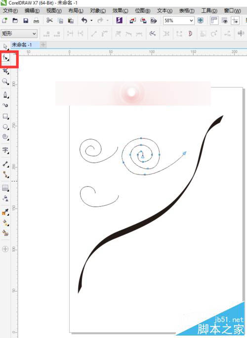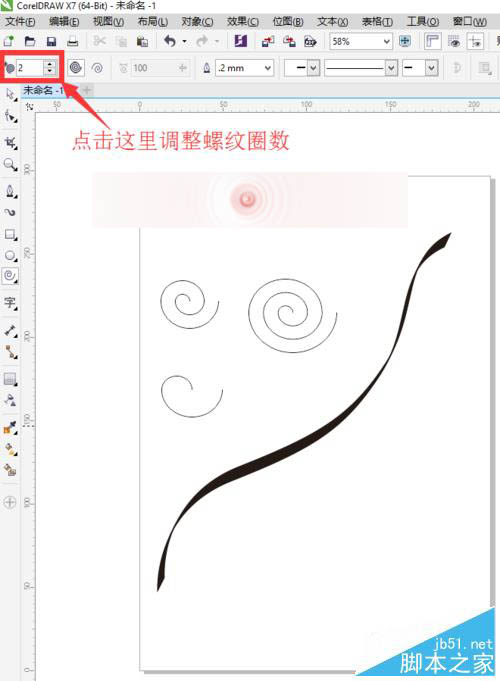 4、選擇工具箱中的螺紋工具,在屬性欄中設(shè)置螺紋圈數(shù),分別設(shè)置為1 .2 .3 ,畫(huà)出3條螺紋出來(lái)。我們可以選擇工具箱中的形狀工具,點(diǎn)擊節(jié)點(diǎn)將其調(diào)整一下,太規(guī)則的話,看起來(lái)不是很自然。