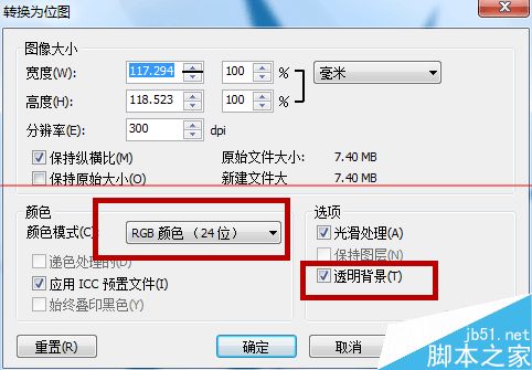 3、就會出現一個【轉換為位圖】的對話框,但是有一點一定要注意,顏色背景一定要是RGB格式,選項中透明背景前邊一定要打勾,才可以。