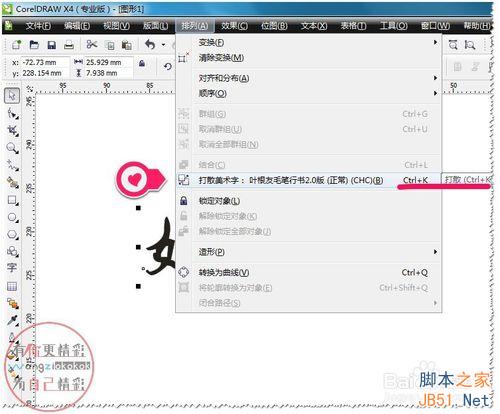在菜單中選擇排例,在下拉菜單中找到打散美術字。