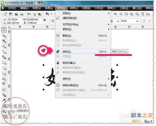 在菜單中選擇排例,在下拉菜單中找到結合。