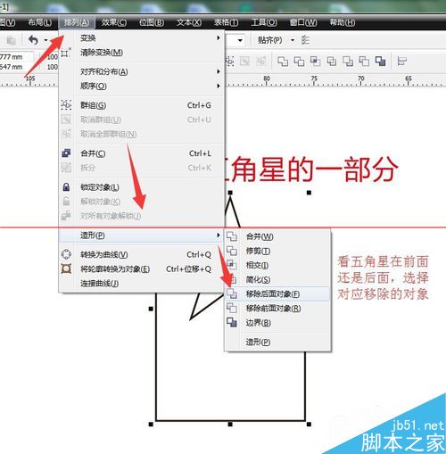2、同時選中正方形和五角星,確定五角星是在正方形前面還是后面,本文中五角星是在正方形后面,如果點擊排列--造形--移除后面對象。注意:如果五角星是在正方形前面,則移除前面對象。