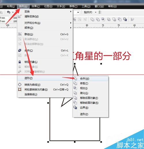 2、同時選中正方形和五角星,點擊排列--造形--合并。