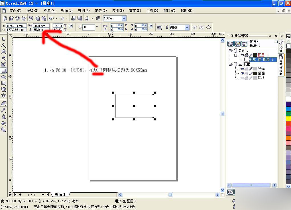 2、打開CorelDRAW軟件,系統自動建立一個"圖形1"文件。選用工具箱中的矩形工具,在系統給定的紙張上面畫一矩形,調整大小為90 x 55mm(假設此為一張名片的成品外框),然后再在其內部重新畫一個矩形,大小設為80 x 45mm(此將其假設為名片的有效印刷區)。選中兩個矩形,按"C"、"E"鍵或點"安排"菜單"對齊與分布",將兩個矩形居中對齊。